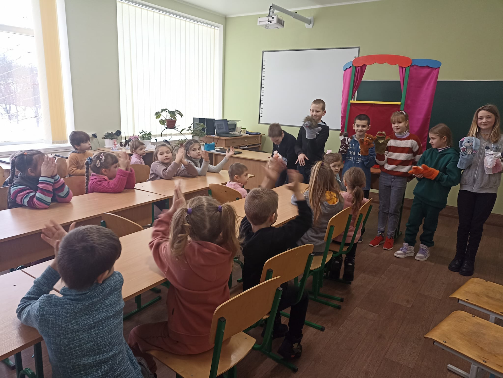 Під гаслом «Бути своїми» розпочалося красиве дійство: показ костюмів казкових героїв. П’ятикласники показали театральну виставу до українських народних казок «Рукавичка» та «Ріпка» для учнів 1-4 класів та вихованців дитячого садочка.